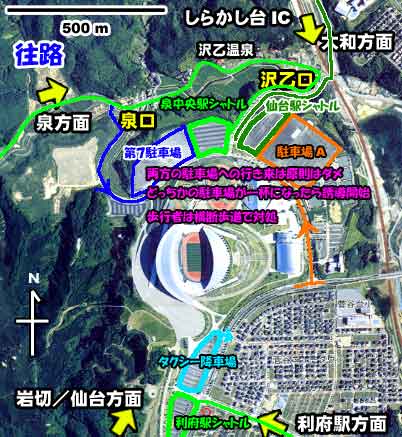 6.ゲートで帰りのチラシをまく。そのチラシの中では地図の他に、入場口にかかわらず、駐車場Aは菅谷台三叉路あるいは沢乙口(シャトルバス終了後)へ、第7駐車場は泉口(選手移送後)あるいは沢乙口(シャトルバス終了後)から出ることとなる旨、書いておく。