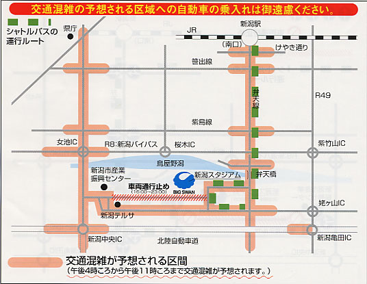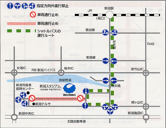 1・交通規制について 交通規制が行われますので御協力をお願いします。 5月31日(木)、6月2日(土)、6月4日(月) 午後4時〜午後11時まで スタジアム周辺は観戦客の方のマイカーの乗入れはできません。 ![]() 2002年FIFAワールドカップ新潟県推進委員会事務局/新潟県警察 TEL025(280)5272 |