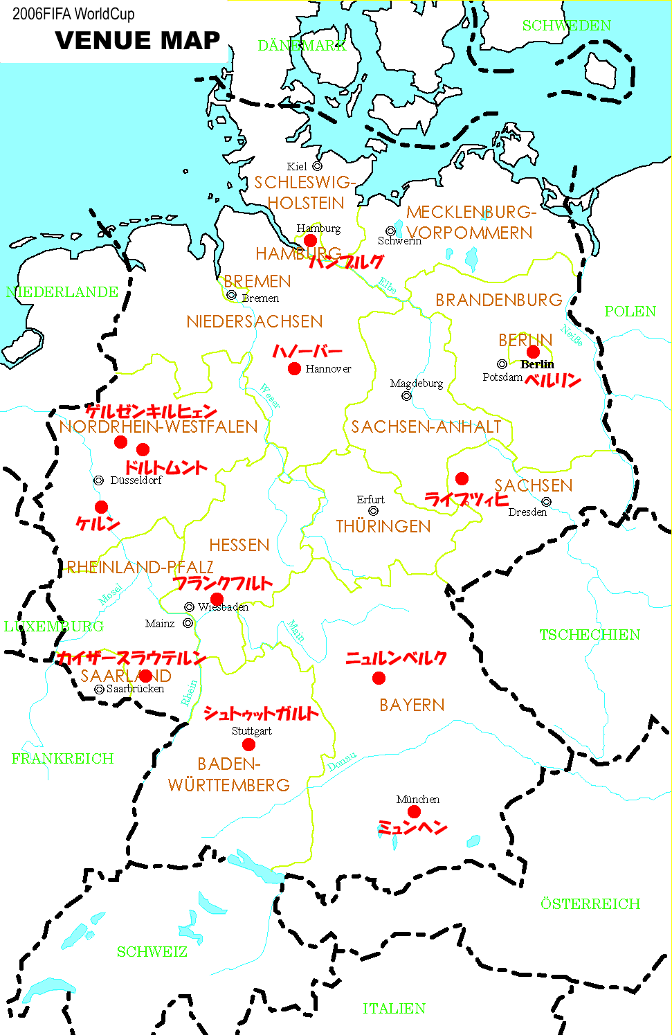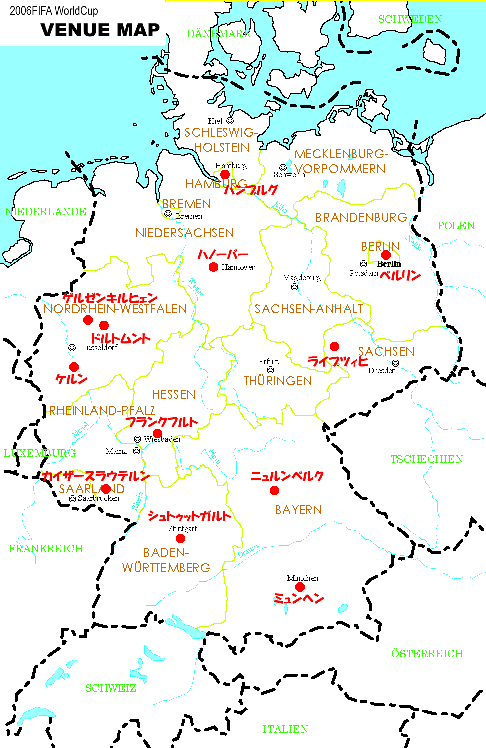 2003年 12月 各大陸予選の組合せ抽選会 2004年 4月 各大陸予選スタート 5月 ワールドカップスケジュール決定 2005年 6〜7月 コンフェデレーション杯(プレ大会)開催 11月 ワールドカップ出場全32チーム決定 12月 ワールドカップの組合せ抽選会 2006年 6月9日 ワールドカップ開幕(ミュンヘン) 7月9日 ワールドカップ決勝(ベルリン) | ||||||||||||||||||||||||||||||||||||