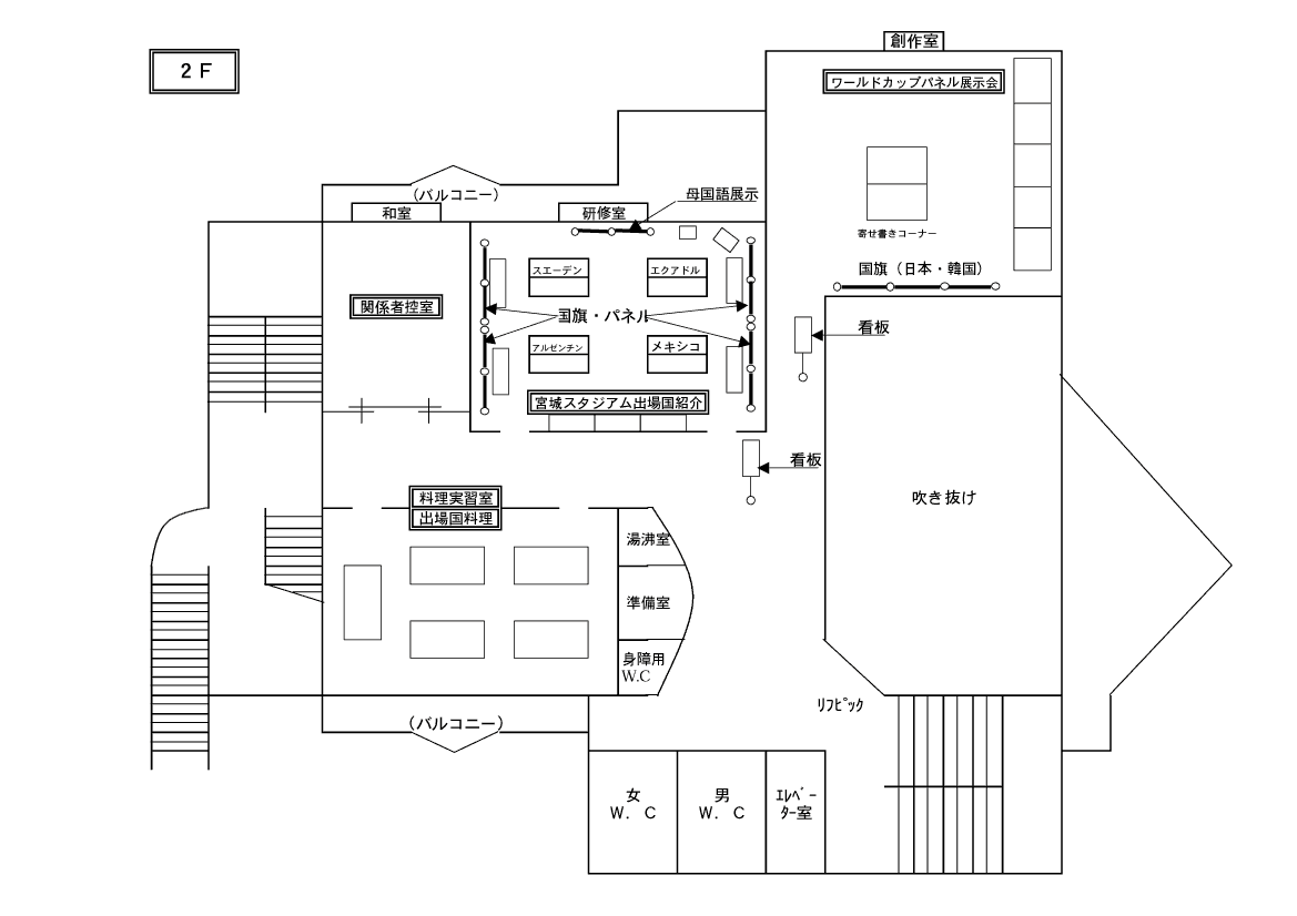 2階: ワールドカップパネル展、宮城スタジアム出場国紹介(各国料理も)