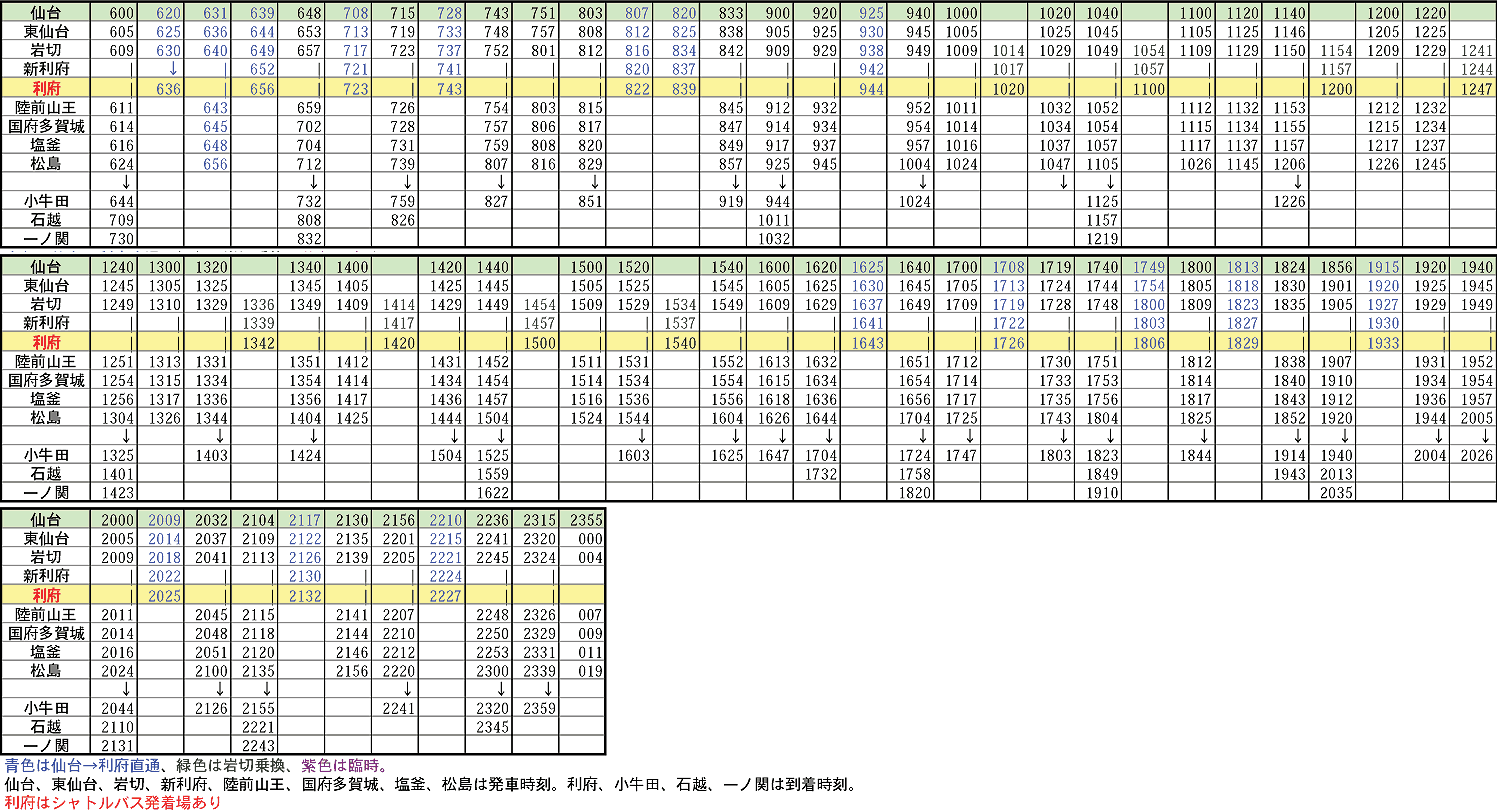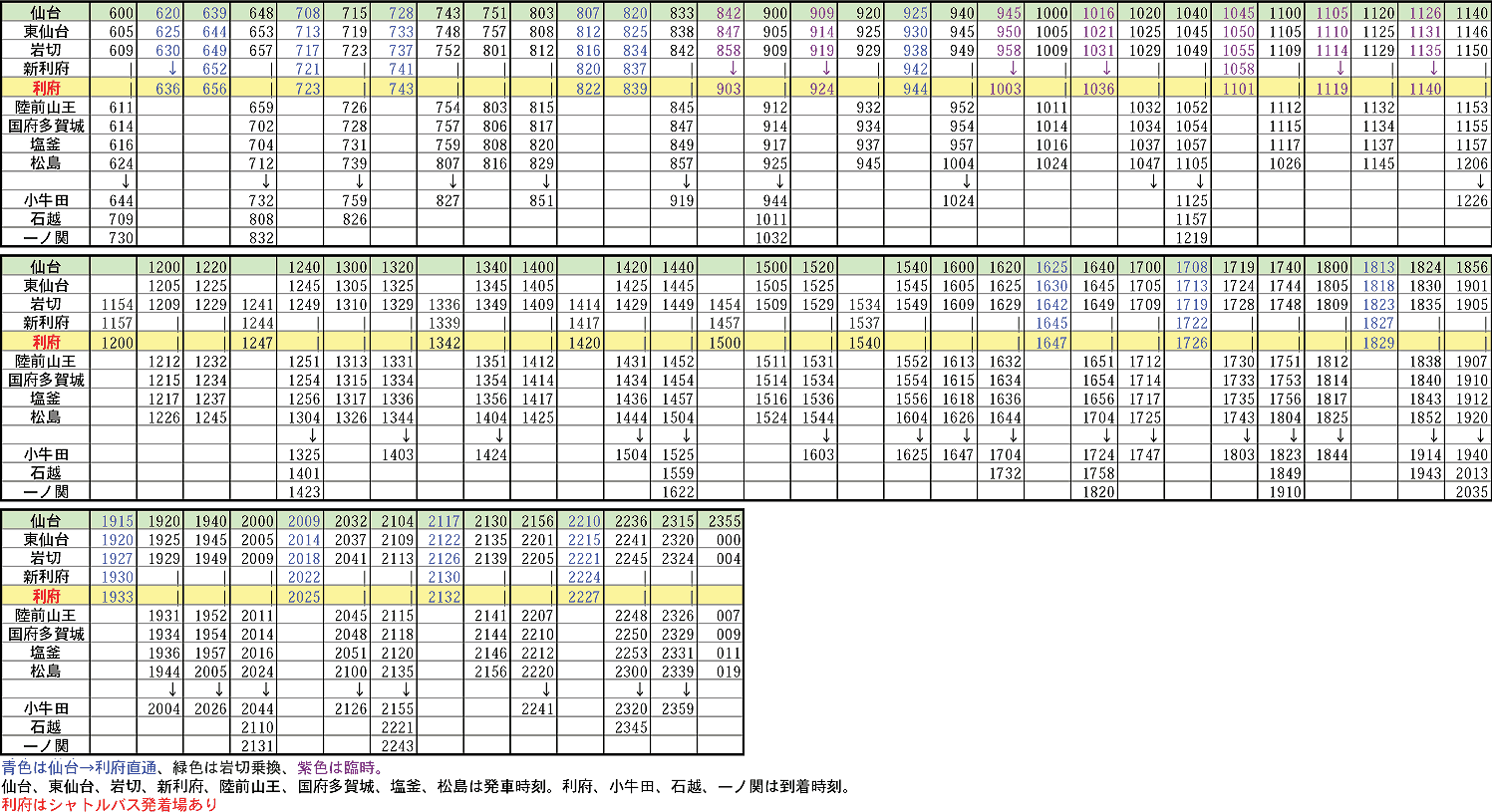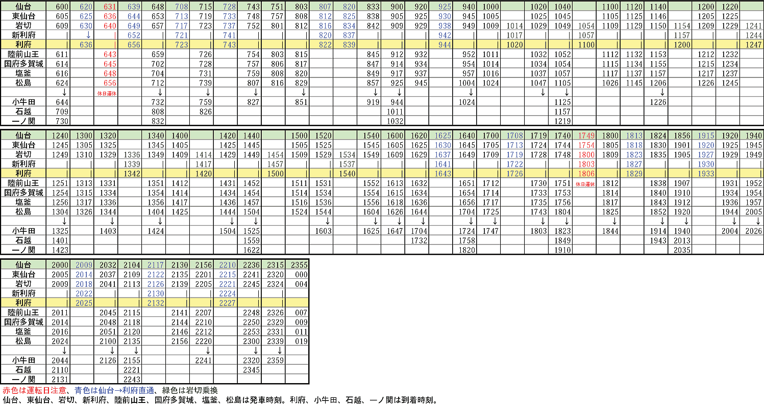 仙台→利府・松島の時刻表が表示されます。その他の時刻表は左からリンクされています。