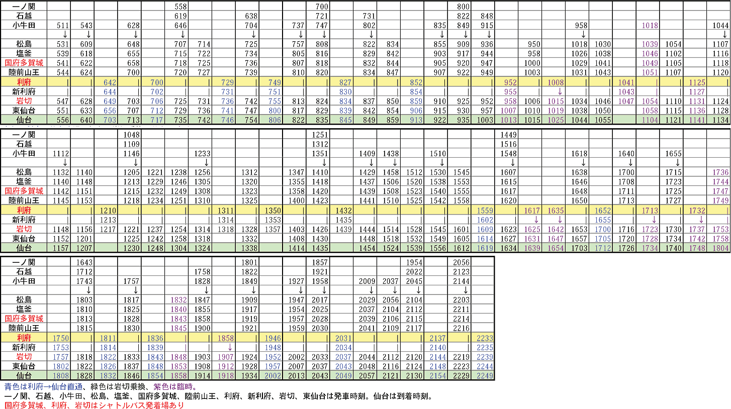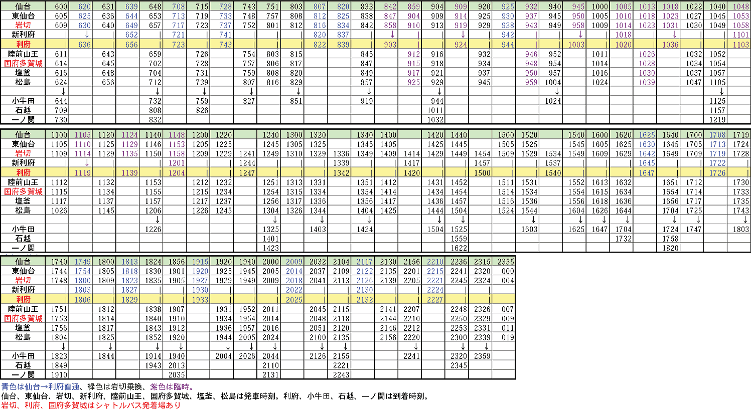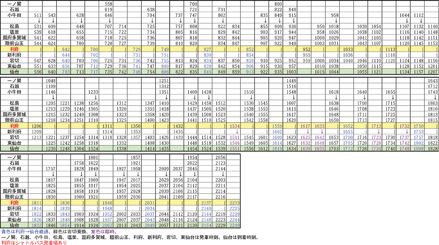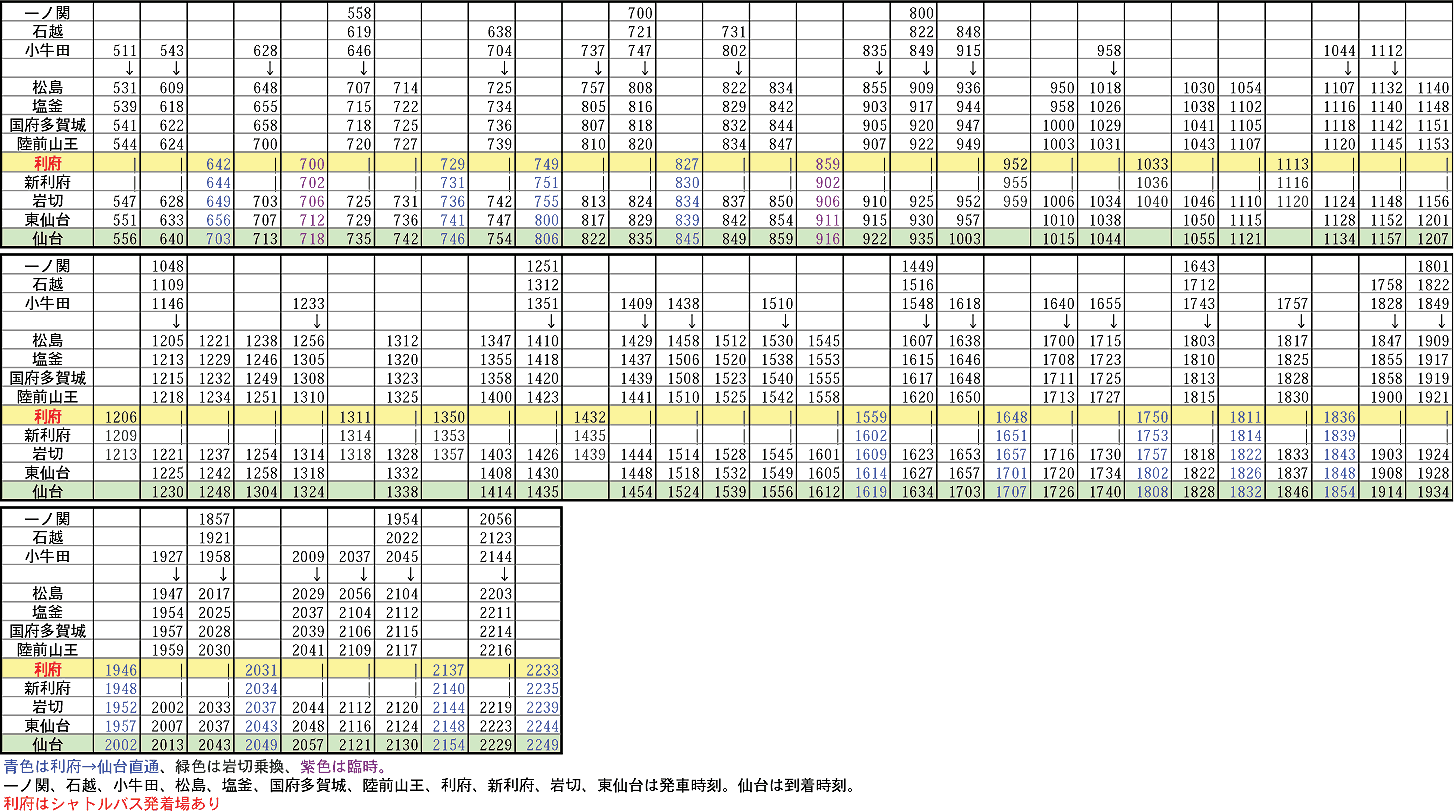仙台→利府・松島の時刻表が表示されます。その他の時刻表は左からリンクされています。