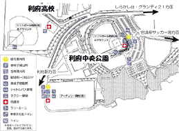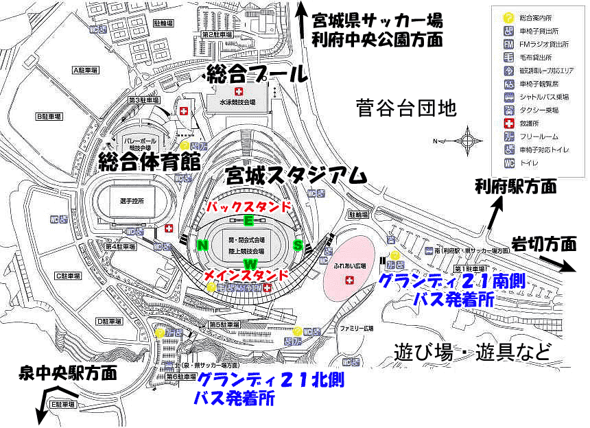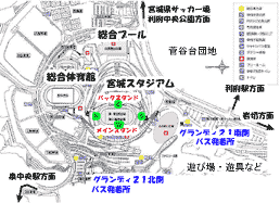 グランディ21の施設、宮城スタジアム(開会式、閉会式、陸上競技)、総合体育館(バレーボール)、総合プールはいずれも、利府駅から北西方向に約3kmです。 利府町中央公園(野球場、多目的運動場)、宮城県サッカー場は、利府駅から北北西約2kmのところにあります。 グランディ21から、宮城県サッカー場まで、東に2km弱。グランディ21から、利府町中央公園まで、同じく東に約1.5km。 車椅子での移動は、途中アップダウンがきついので、大変でしょう。 |