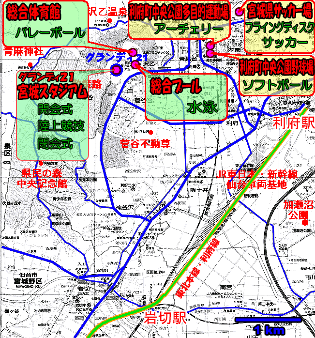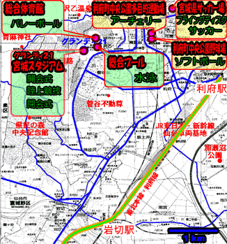 グランディ21の施設、宮城スタジアム(開会式、閉会式、陸上競技)、総合体育館(バレーボール)、総合プールはいずれも、利府駅から北西方向に約3kmです。