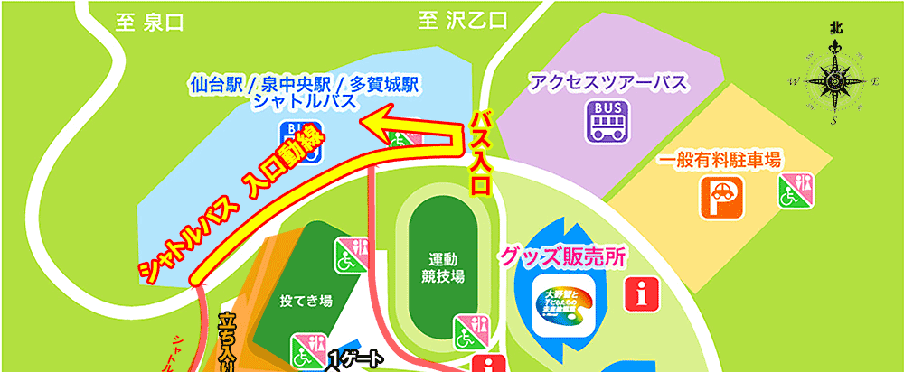 - 仙台駅シャトルバスはこれまでと同様の発着場所・ルート、泉中央駅シャトルバスは泉区役所内区民広場(駐車場の横)に変更・ルートは一緒、多賀城駅シャトルバスは以前日本代表戦で運行したルート(仙台北部道路経由:しらかし台IC⇔仙台港北IC)、利府駅シャトルバスはこれまでと同様の発着場所・ルートです。