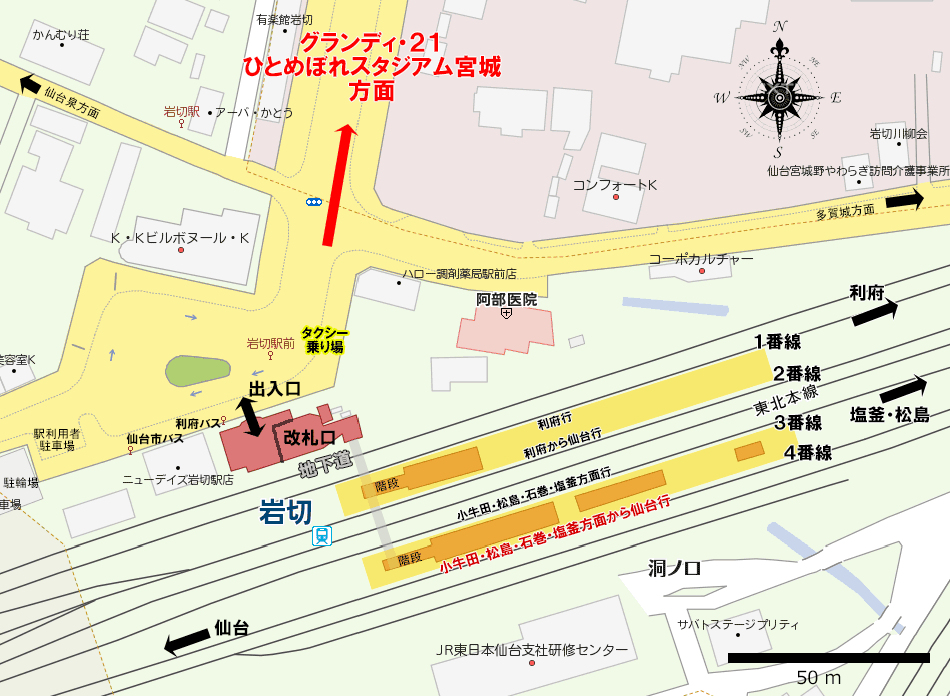 岩切のメリットは,帰り,小牛田・松島からの電車に乗れること(時刻表はこちら 20:29, 20:55, 21:12, 21:25, 22:28).利府からの電車は全て2番線発着.小牛田・松島方面からの電車は全て4番線発着.岩切で待つのなら4番線で.列車は一部を除いて4両編成. 改札口から入り階段を降りて地下通路に.手前のホームが1,2番線.奥のホームが3,4番線.ホーム上に待合室があるのは3,4番線.- 帰りに,利府駅まで徒歩で行く方へ! 利府駅徒歩の情報はこちらも参考に.