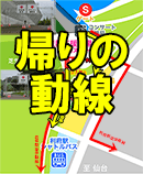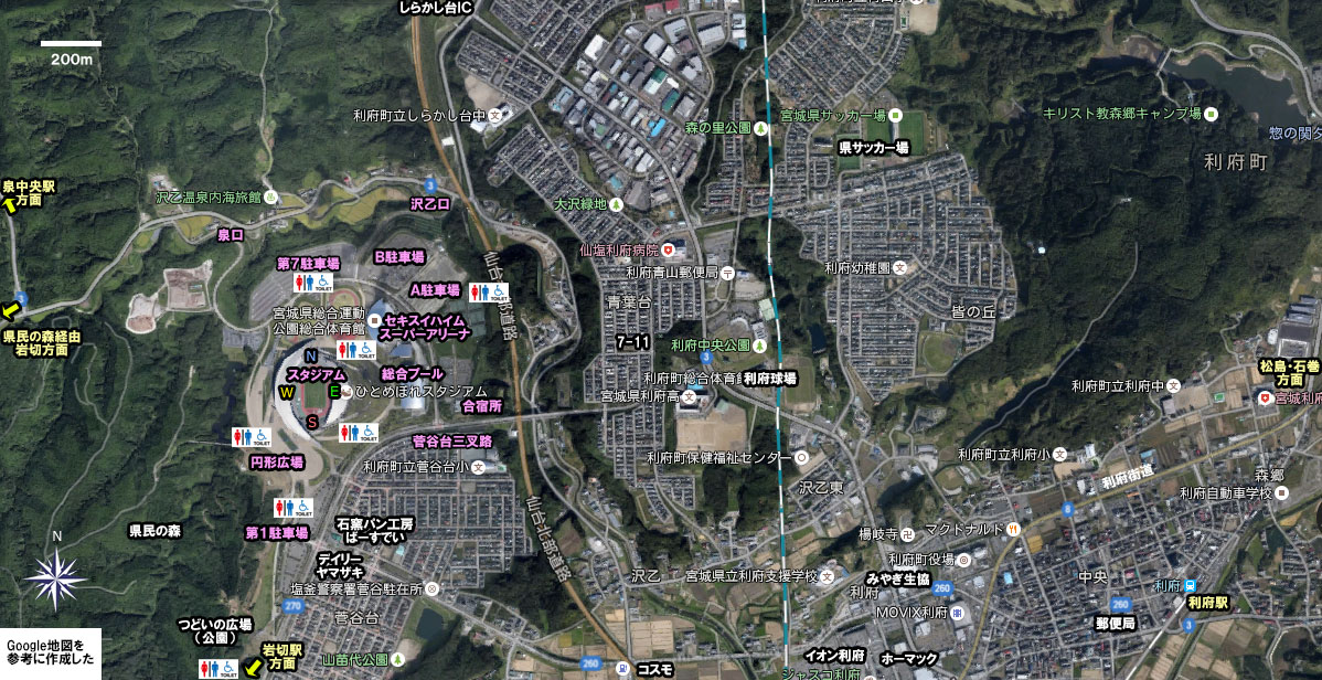 上の地図をご覧いただき,交通事故に遭うことのないよう,歩道を利用してください.スタジアム近くの道路【利府or岩切⇔スタジアム間も】にはすべて歩道があります.利府街道の一部(岩切-東仙台間の田園地帯 数km)には歩道がないか,非常に狭い歩道となっていますので,自転車の方は十分に注意してご通行ください.雨天の可能性もありますので,自転車の方は必ず合羽をご持参ください.