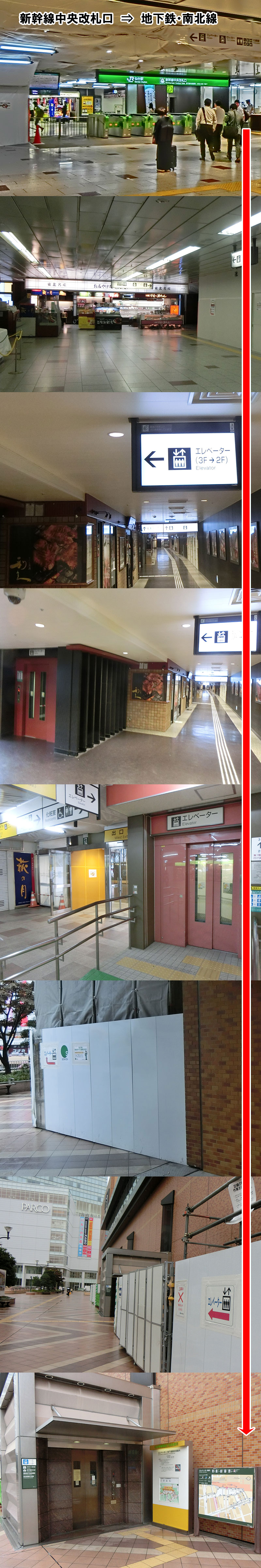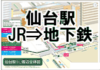 新幹線中央改札(3階)を出て右手,牛タンストリート「利久」の手前,左のエレベーターに乗り,2階へ.エレベーターを出たら,右手後方のペデストリアンデッキ(駅の外)に出て,右手の壁に沿って10m行くと2階から地下1階へのエレベーター.このエレベーターを地下1階で降りて「仙台駅東西地下自由通路」を西に向かって,左に曲がると,地下鉄南北線の仙台駅です. [参考URL: 本交通アクセス情報の「仙台駅」中の「乗換案内」(2007年の情報です) |