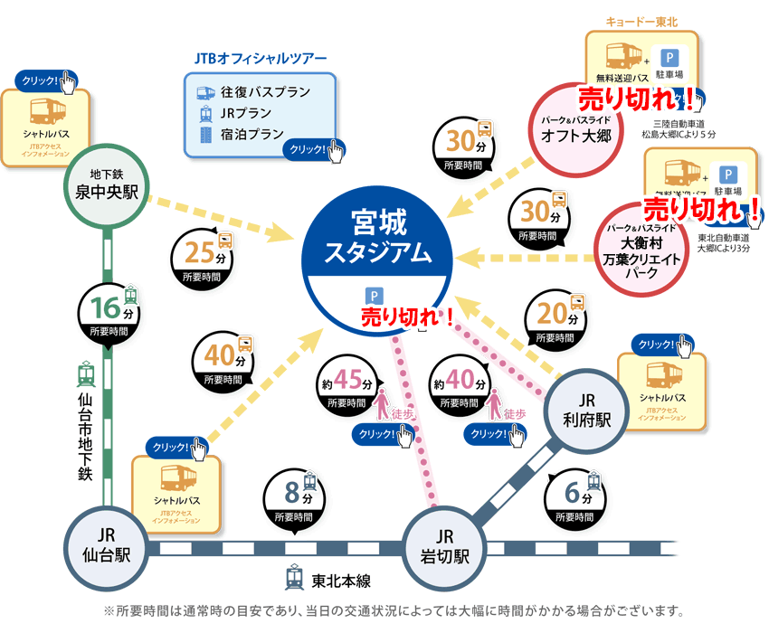 - 公共交通の場合、スタジアムへのアクセスの最後は必ずシャトルバスになるので、どのシャトルバスに乗ってもいいように、予め、ルートを確認しておきましょう。