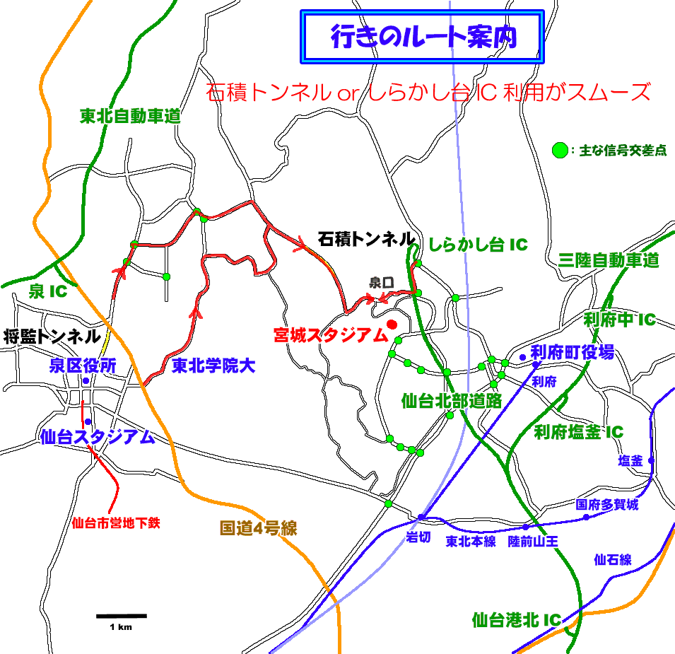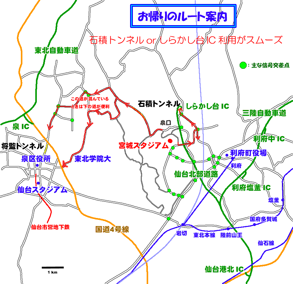 のように、特に岩切、利府方向からの道路が混むことが予想される。 |