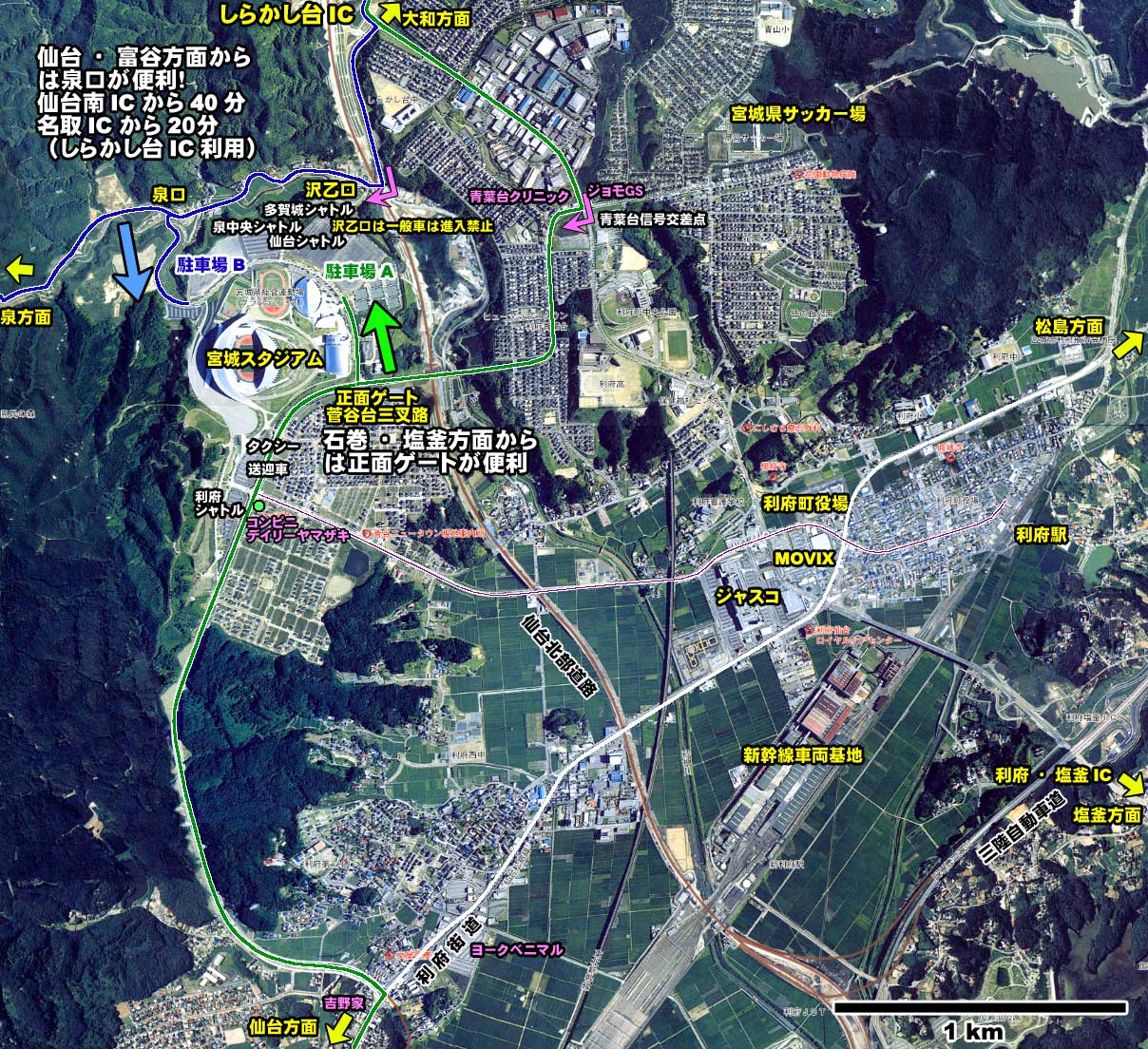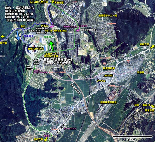 - ルート2B: 仙台北部道路・利府しらかし台IC→グランディ・21正門ゲート