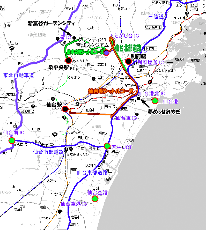 ⇔(新寺小路)⇔仙台東部道路・仙台東IC⇔(仙台東部道路)⇔(仙台北部道路)⇔利府しらかし台IC⇔グランディ・21沢乙口 所要40〜60分