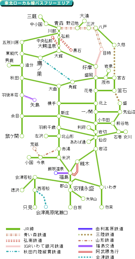 ・「東北ローカル線パス」フリーエリア内では、JR 線と10社の鉄道会社線の普通列車(快速を含む)の普通車自由席が利用可能