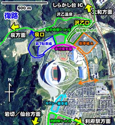 6.ゲートで帰りのチラシをまく。そのチラシの中では地図の他に、入場口にかかわらず、駐車場Aは菅谷台三叉路あるいは沢乙口(シャトルバス終了後)へ、第7駐車場は泉口(選手移送後)あるいは沢乙口(シャトルバス終了後)から出ることとなる旨、書いておく。