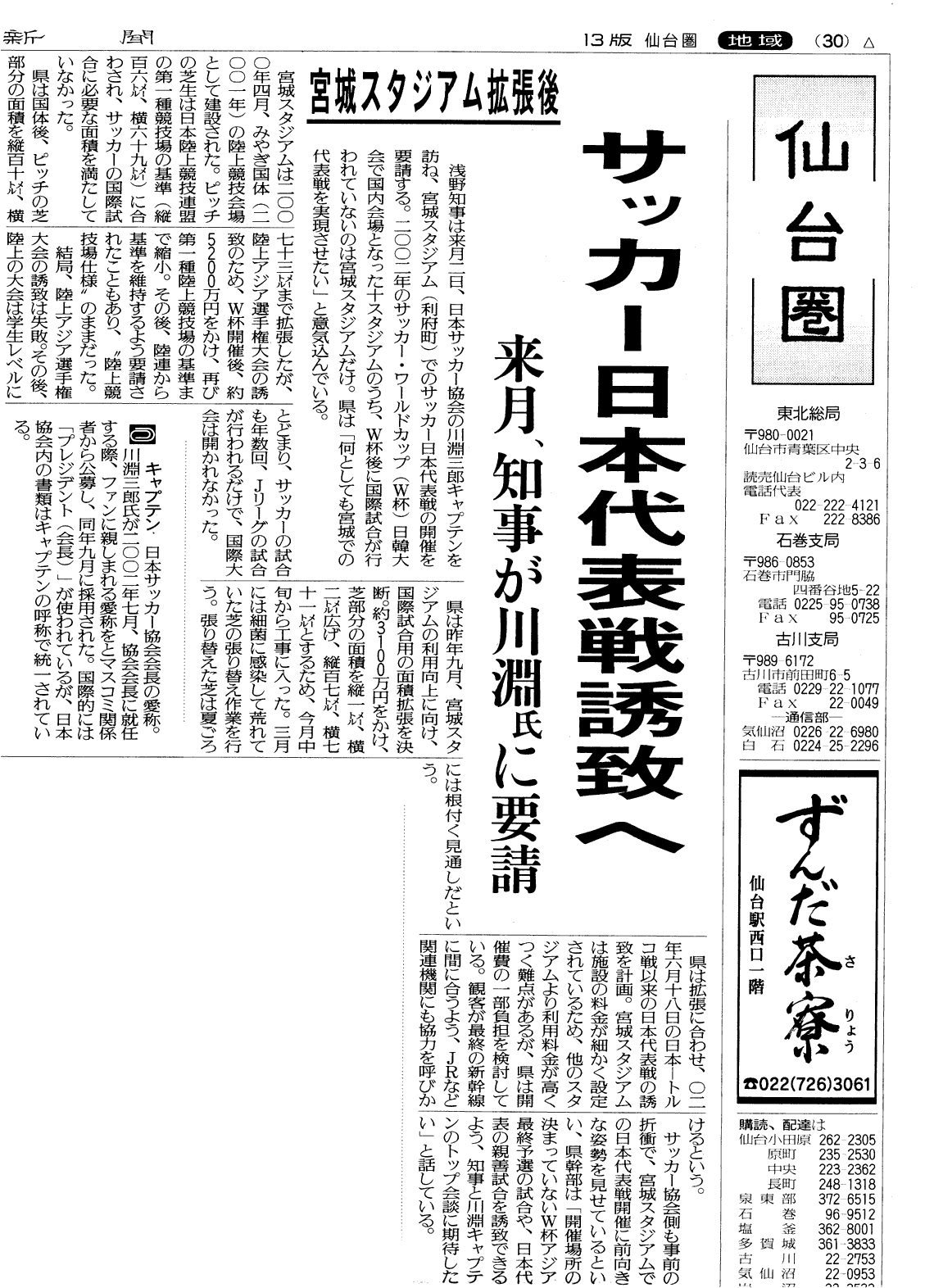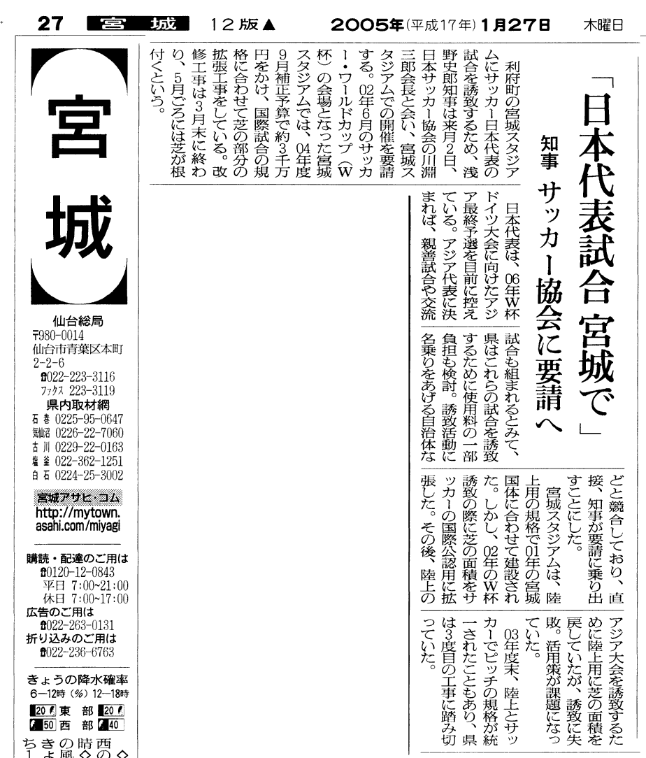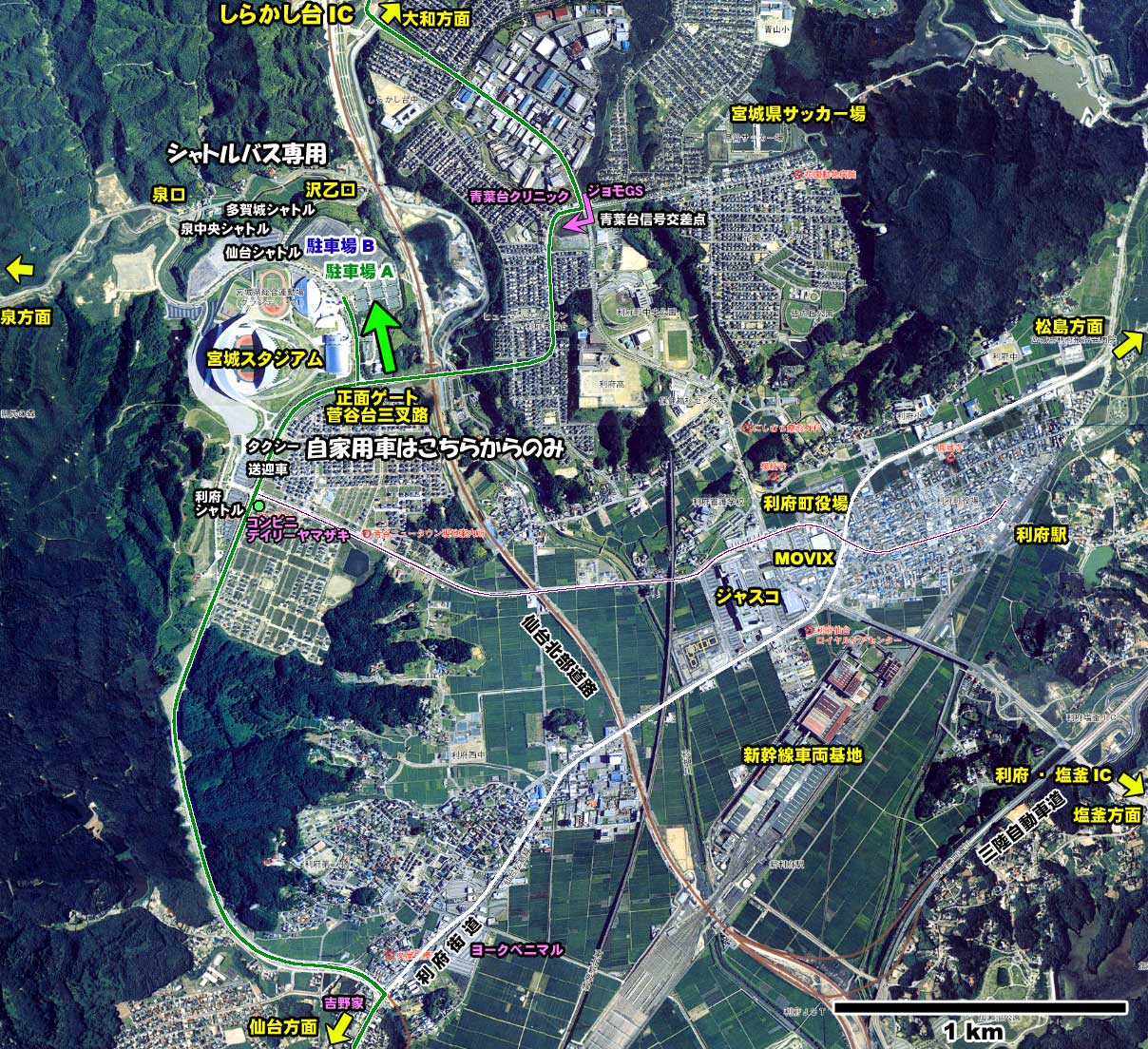 2月3日朝刊各紙によると「2005年中、秋ごろにA代表戦を宮城スタジアムで行う」と川渕・日本サッカー協会会長が明言したそうである。 1月26日付、讀賣新聞仙台圏版、1月27日付、朝日新聞宮城県版に、宮城県知事が川渕キャプテンに直接、日本代表戦の宮城スタジアム開催を要請に行くという記事が掲載された。果たして今の宮城スタジアムに日本代表戦を呼ぶことができるのかどうか、代表戦開催のための3つのポイントをまとめてみたい。 3つのポイントとは、 である。 アクセス改善 まず酷評され続けている、アクセス改善について考えてみよう。このアクセス改善は3つのポイントの中で最も重要であり、かつ宮城スタジアム開設以来常に言われていたことである。 問題に入る前に。 本当は宮城スタジアムをぶっ壊さないための最低条件・2ページ目で述べているように、岩切からの専用軌道が必要不可欠なのだ。 でも、もしそれができないのなら、岩切からのシャトルバスが必要と考えているのだ! そして、さらに譲歩した案が、本HPにおける「50,000人対応の輸送計画 ver.2(案)」であるのだ。それを前提に、ここは読んでもらいたい。 そこでまずは、本HPにおける「50,000人対応の輸送計画 ver.2(案)」を見てもらいたい。一昨年のSMAP開催における失敗を元に作成したものだ。今回、代表戦は19:30キックオフとして、延長戦・PK戦はないのと(アジア最終予選方式はこちらを参照のこと)、45分ハーフ(15分休憩)で前後半通常3〜4分のロスタイムがあることを考慮すると、試合終了は21:20分頃と思われる。「50,000人対応の輸送計画(案)」に書いたように、“21:30以降の終了時刻では問題が大きい”という点はクリアしている。 とすれば、交通アクセスの計画は試合終了後、どうやってスムーズに観客を鉄道の駅まで運ぶかの1点にかかっている。 上り最終やまびこ280号(郡山行、土休日運休)は22:10仙台発であるが、これに間に合うのは無理がある。仙台駅シャトルバスは所要30分であるし、利府駅シャトルバスも15分(利府ー仙台間は15分)かかる。讀賣新聞にあるような最終の新幹線に間に合うためには、キックオフ時刻を早めないとダメだが、Jリーグオールスターのときに19時キックオフを18時キックオフにして顰蹙を買った経緯もあり、せいぜい19時10分頃のキックオフ(テレビ放映を考えると)にしないとだめだろう。とすると、恐らくぎりぎりとなる。