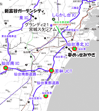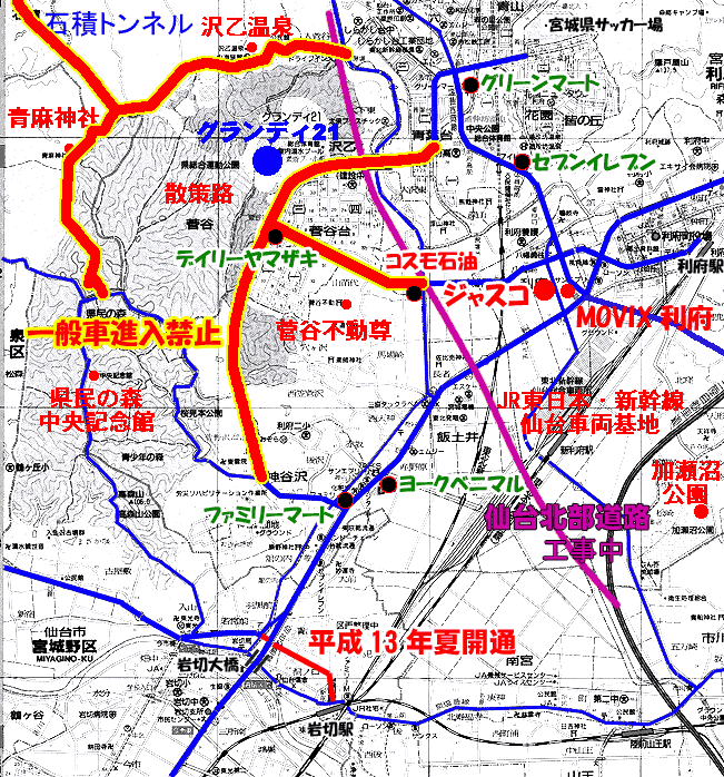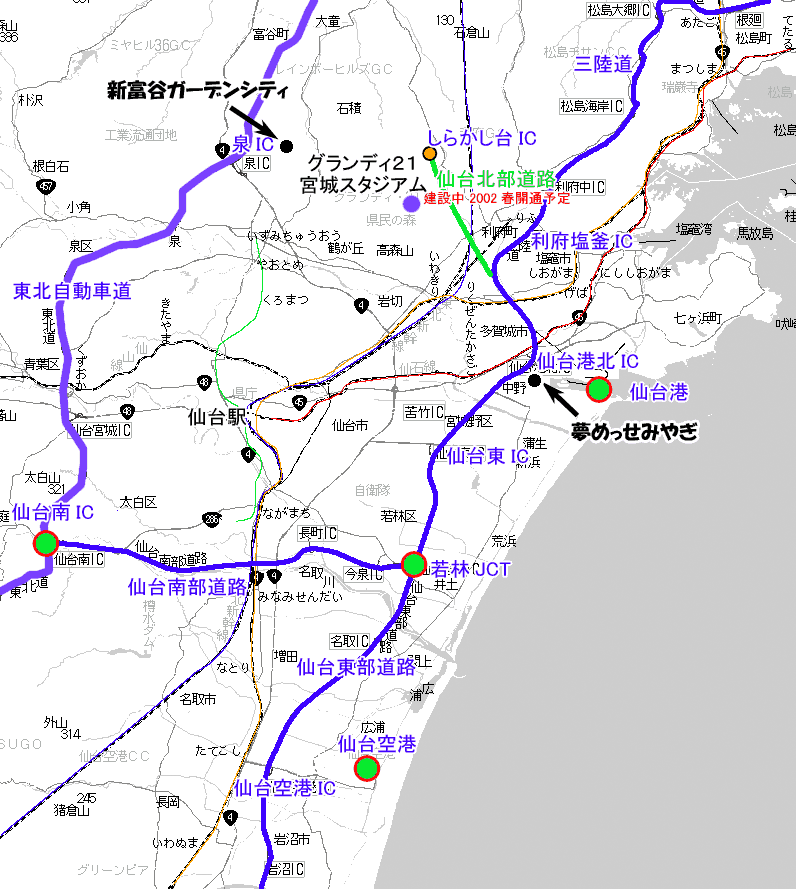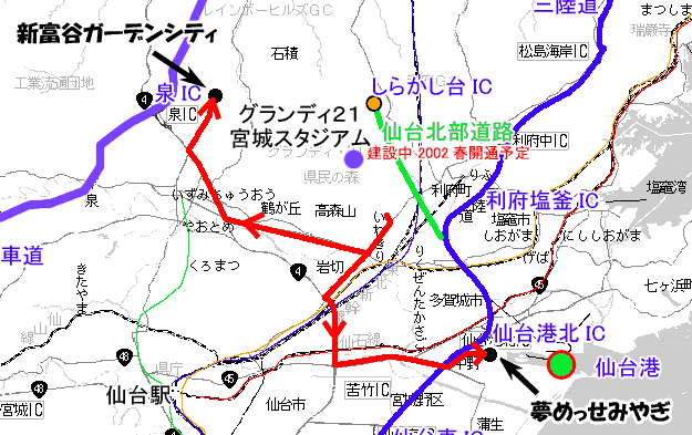 利府街道から左折して「運動公園岩切停車場線」に入って、3つ目の信号(左折すると、県民の森方面)からが規制区域。 ここから先は、次のグランディ21正面の信号まで分岐道路はないからである。 この先、グランディ21を過ぎて、陸橋を渡り、青葉台入口までの規制とすれば、途中の分岐道路は、菅谷台団地に入る道路の3箇所(1箇所は岩切方向車線からの左折専用)と、グランディ21内に入る信号交差点、それに、グランディ21前の信号交差点(ジャスコ−利府駅方面の運動公園利府停車場線)の5つの交差点だけで、流入車両等を防ぐことができる。 一方、利府駅−ジャスコから菅谷台団地を抜けてグランディ21正面に至る、運動公園利府停車場線は、できればジャスコ西から規制をかけたいが、上記地図では、さらにグランディ21寄りの、コスモ石油GS交差点からの規制にしてある。 ここからグランディ21までにある交差点は、沢乙部落方面の小さな道、菅谷地区(菅谷不動尊方面)方面の小さな道の2つの小さな交差点と、菅谷台団地内の2つの信号交差点だけである。 車両通行止めは、コスモ石油交差点と、2つの小さな交差点で実施すればよいこととなる。 このように、流入車両が少なく、かつ交差点が少ないところを通行禁止とする方が効率的である。 コスモ石油の交差点から西を封鎖すると、この交差点で大渋滞が起こる可能性があるので、本当は、「我が町、利府を宣伝しよう!」で示したように、ジャスコ西側からグランディ21までを通行禁止とした方がいいのだ。 ただ、ジャスコ西側からコスモ石油の間を規制すると、この道と平行して走る、北側の、青葉台団地に近い道が混雑する。 が、利府駅からの観客を飽きさせない手法をとることを考えると、この道(ジャスコ西側−グランディ21正面に至る道)は、菅谷台団地住民も含めて、完全な車両通行止めにしてもいいのではないか、と思う。 菅谷台団地住民は、運動公園岩切停車場線(グランディ21と岩切寄りの利府街道を結ぶ道)を利用すればいいのだから。 さて、北側の沢乙温泉の方、入菅谷地区の交通規制は、選手役員を運ぶための道として確保すべきだろう。 これは国体も同じ考え方である。 こちらも、東側の入菅谷入口から県民の森手前までと、石積トンネルを規制すれば、途中に流入車両もなく、スムーズな交通規制が可能である。 次は規制時間帯。 2002年6月9,12,18日は、いずれも15:30キックオフだ。 昨年(2000年)6月のキリンカップでは13:30キックオフで、10:00頃から渋滞状態となった。従って、3時間以上前から交通規制をかける必要がある。 具体的には、12:00〜20:00の8時間の規制が必要と考えられる。 さらに、パークアンドバスライド券を有する、多くの自家用車が間違えて、グランディ21に向かう可能性がある。 これらの自家用車は、仙台港の「夢めっせみやぎ」か、新富谷ガーデンシティに誘導しないといけない。 誘導のために、利府街道から左折した先の道に誘導案内図を出す必要がある。 通常は上記のように、「新富谷ガーデンシティ」に向かう人は東北道・泉ICで降りて、最初の信号を左折すればok。 「夢めっせみやぎ」に向かう人は東北道・仙台南ICから、仙台南部道路→仙台東部道路を経由して、仙台港北ICで降りて、左折2回でok。 ところが、宮城スタジアム至近まで来てしまうと、